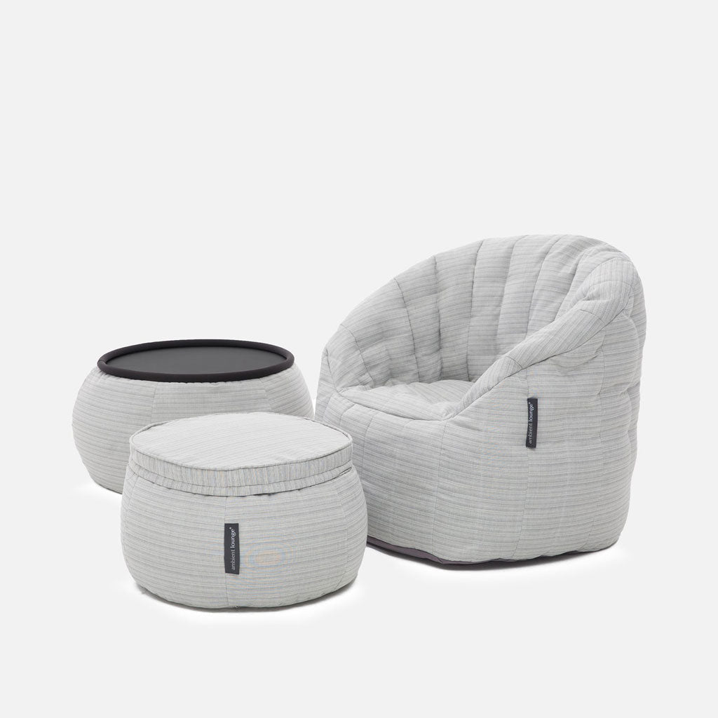 Contempo Outdoor Pakkinn stendur undir nafni sínu. Contemporary þýðir nútímalegt á ensku, og Contempo Outdoor Pakkinn kemur á óvart með spennandi og krefjandi hönnun sem flestir geta stutt. Sleppið því að skoða leiðinleg og óþægileg húsgögn. Með Contempo Outdoor Pakkinn hafið þið nákvæmlega þau húsgögn sem þið þurfið fyrir hönnun, þægindi og ekki síst notendavænt í húsinu ykkar. Sætipokinn getur einnig verið notaður utandyra þökk sé vatnsheldu og slitsterku efninu.