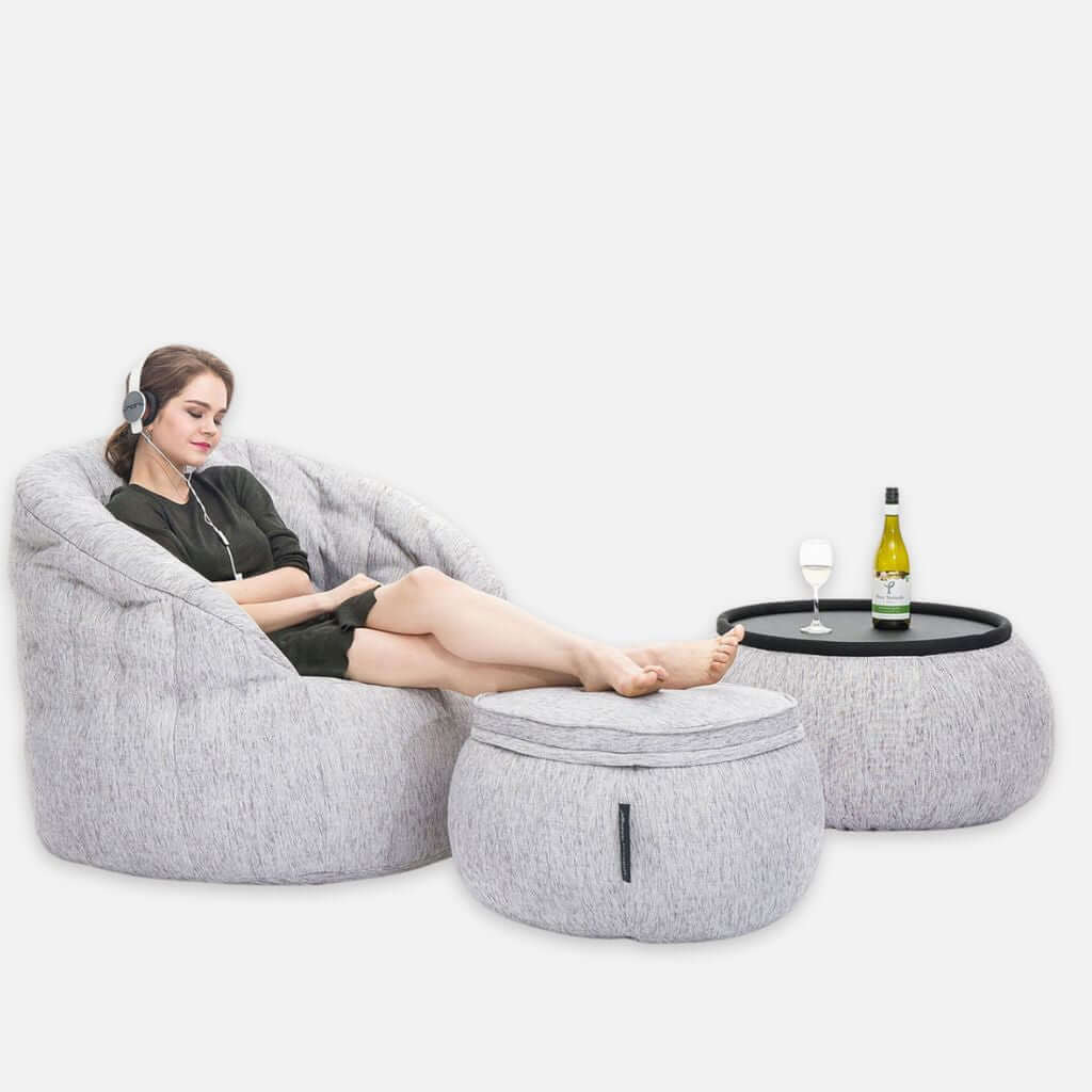 Fyllingarleiðbeiningar:Athugaðu fyrst að það eru tvö fyllingarrými fyrir Butterfly Sittesekk, eitt fyrir bakið og eitt fyrir grunninn (sætishólf). Mælt er með að bakrýmið sé fyllt þétt og sætishólfið sé aðeins lausara fyllt fyrir bestu þægindi og stíl. Notaðu alltaf Ambient Lounge öryggislæsingartæki eða bréfaklemmu til að opna barnalæstar öryggisrennilása á hlífinni á saccosekknum.