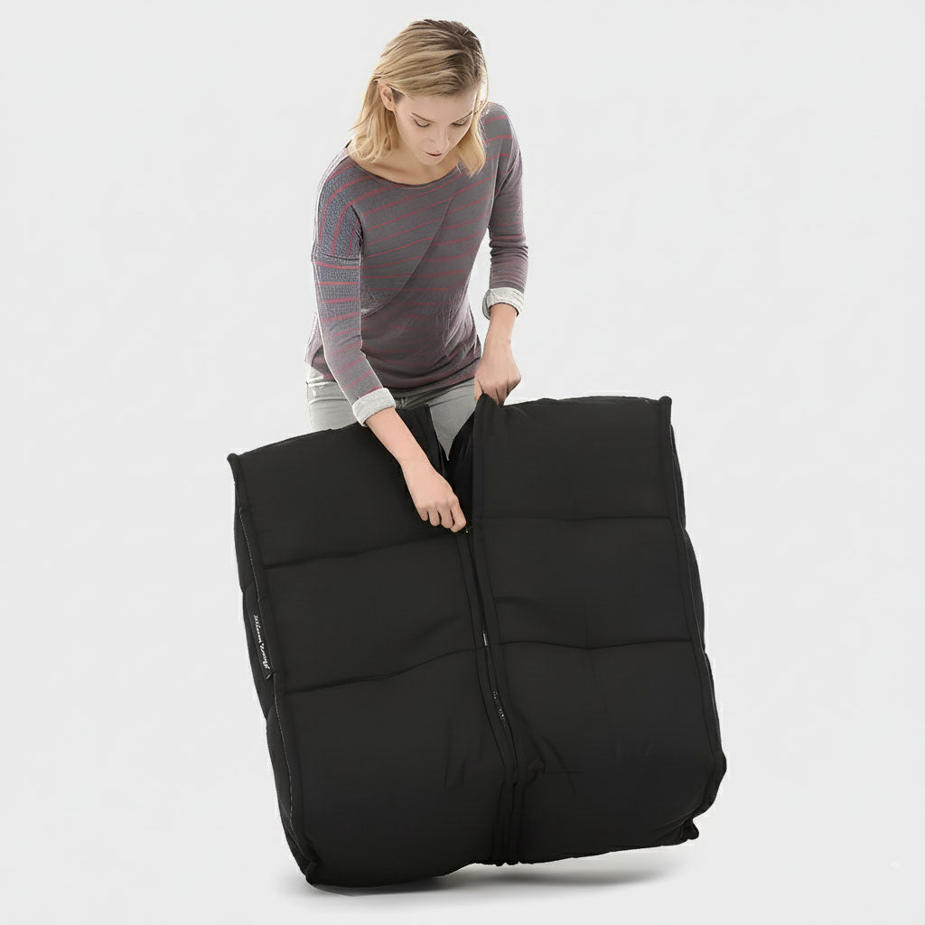 Opnaðu bakhólfið og festu áfyllingarpokann okkar tryggilega við hólfið. Læstu upp og snúðu yfir til að leyfa þyngdaraflinu að vinna mest af vinnunni og tæma allar perlurnar út. Fylltu hólfið eins þétt og mögulegt er, þannig að Twin Ottoman verði traustur og stuðningsríkur. Til að tryggja að allar perlur séu þéttar inni, skaltu hrista og 'ýta' perlum, þannig að þær komist inn og bak við teygjanlegu stoðirnar. Klappaðu fast á ytra efnið í pokanum, þannig að baunir geti fært sig frjálst og fært sig niður í hólfið. Þegar það er þétt fyllt (svo að það fái ekki fleiri perlur inn), lokarðu innri pokanum og rennilásnum að utan.